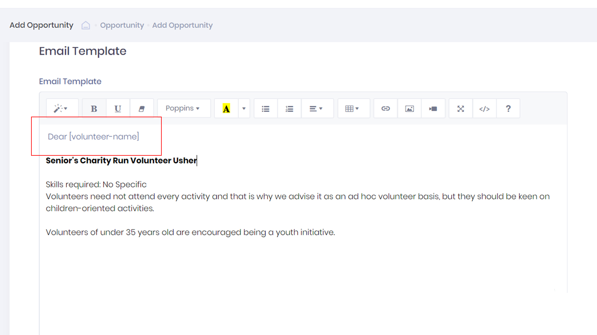 Opportunity Name: [opportunity-name] – The name of volunteering opportunity will appear in the email they received.