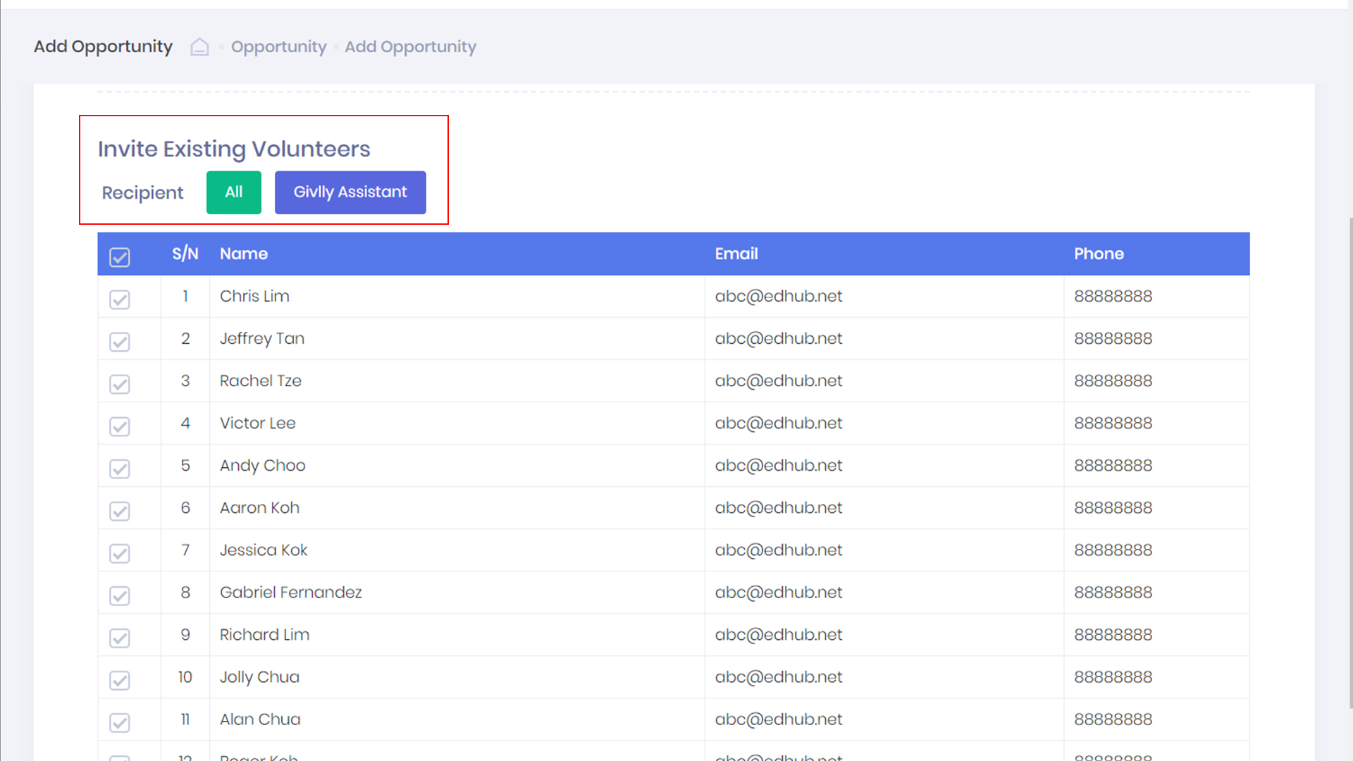 - You can set who will receive the volunteering opportunity either using the All Button to send the invite to every volunteer in your Givlly database or use Givlly Assistant Button to create a more targeted email list.