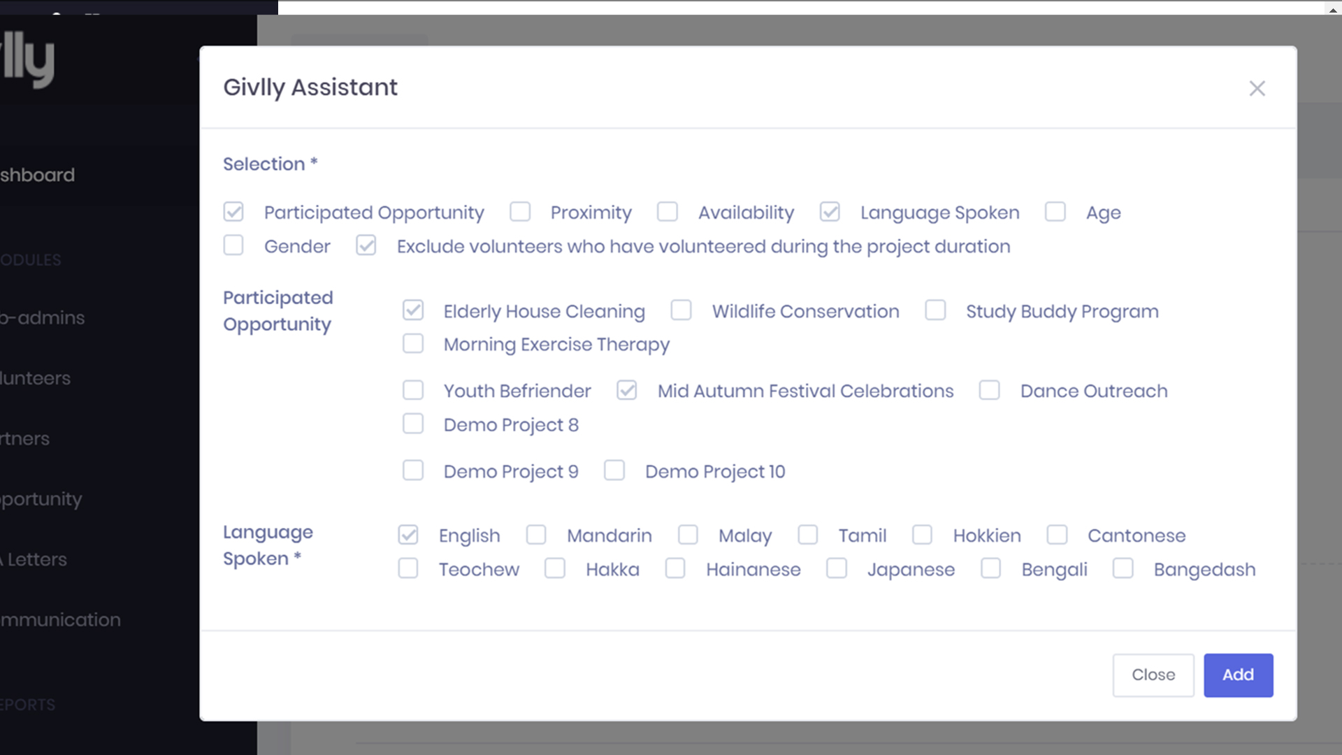 - Language Spoken – Givlly will filter based on the volunteer’s language spoken.