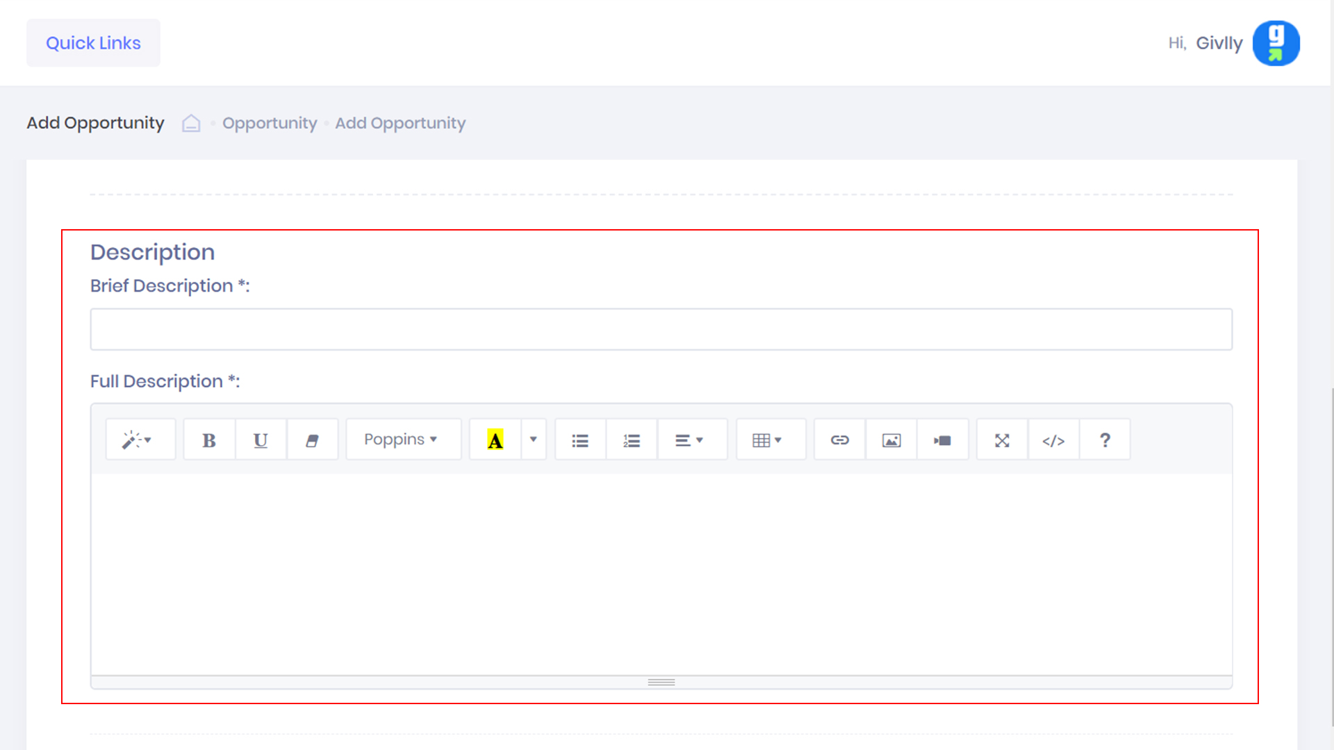 - Then enters both the Brief and Detailed Description of the volunteering opportunity.