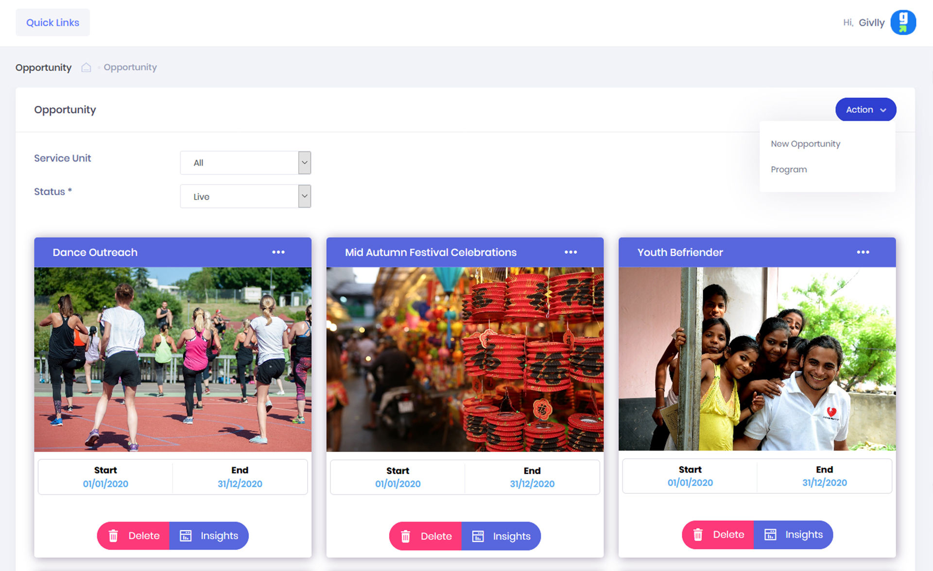- The Opportunity Dashboard will give you an overview of the volunteering events information.