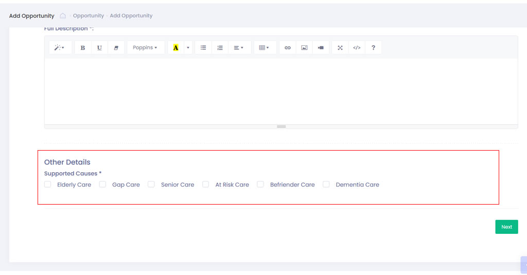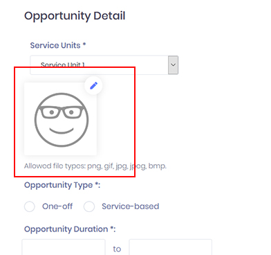 - Then select the opportunity type. You can choose either One-off or Service-based. Next input the name of the volunteering opportunity.