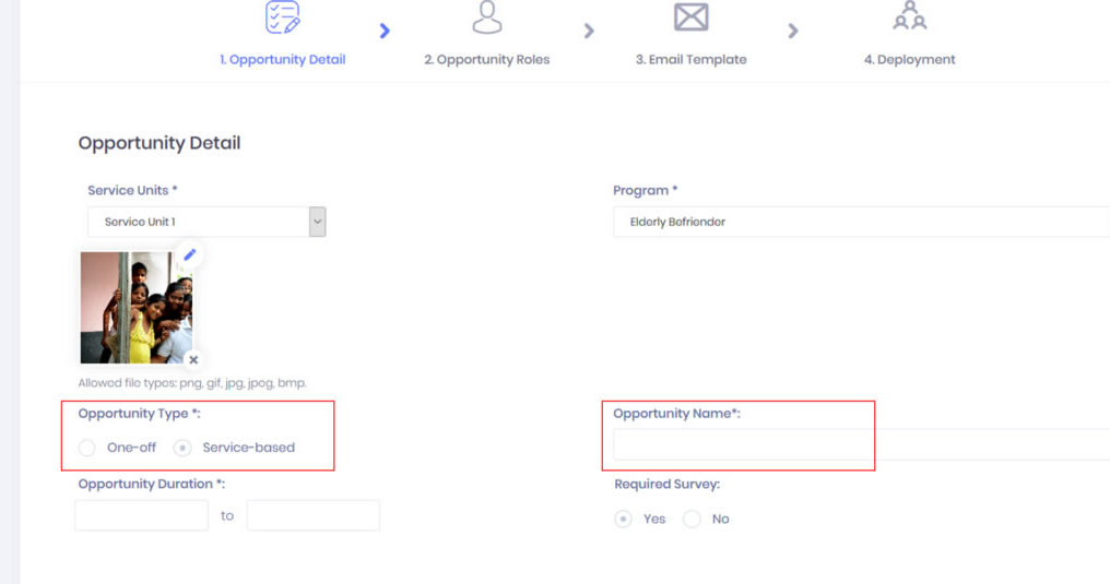 - Then select “Yes” under Required Survey if you need to collect volunteer’s satisfaction feedback.