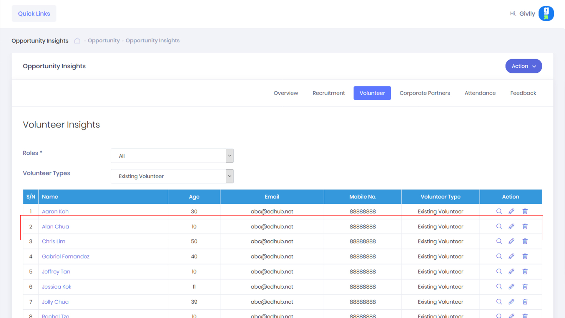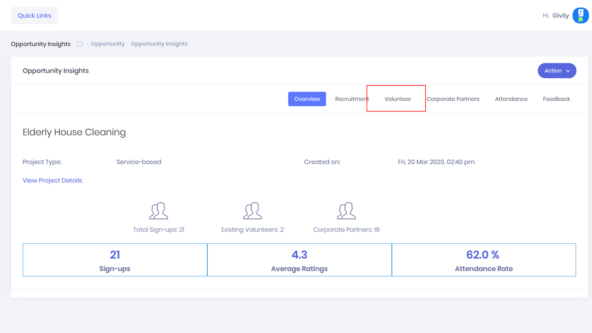 - In an event, if you need to delete a volunteer’s registration from the system. Go to Opportunity dashboard, locate the required project and click onto Insights button.