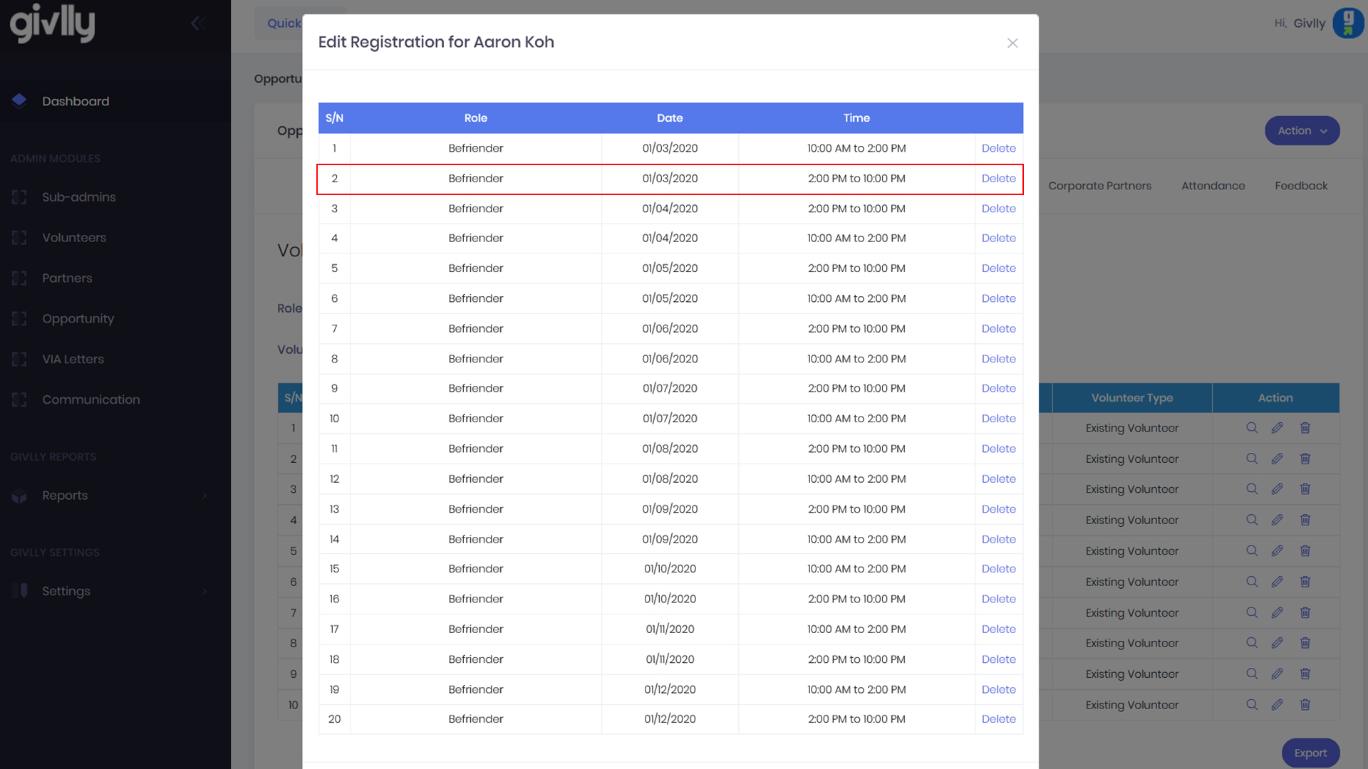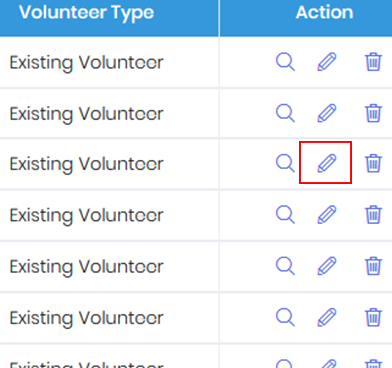 - Locate the volunteer you wish to delete his or her registration and click onto Edit icon in the Setting tools.