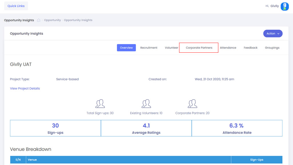 - In an event, if you need to view volunteer recruitment statistics. Go to Opportunity dashboard, locate the required project and click onto Insights button.