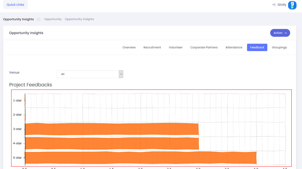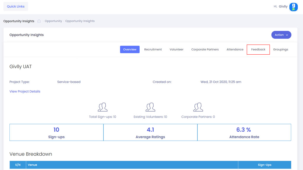 1. In an event, if you need to review volunteer’s satisfaction survey from the system. Go to Opportunity dashboard, locate the required project and click onto Insights button.