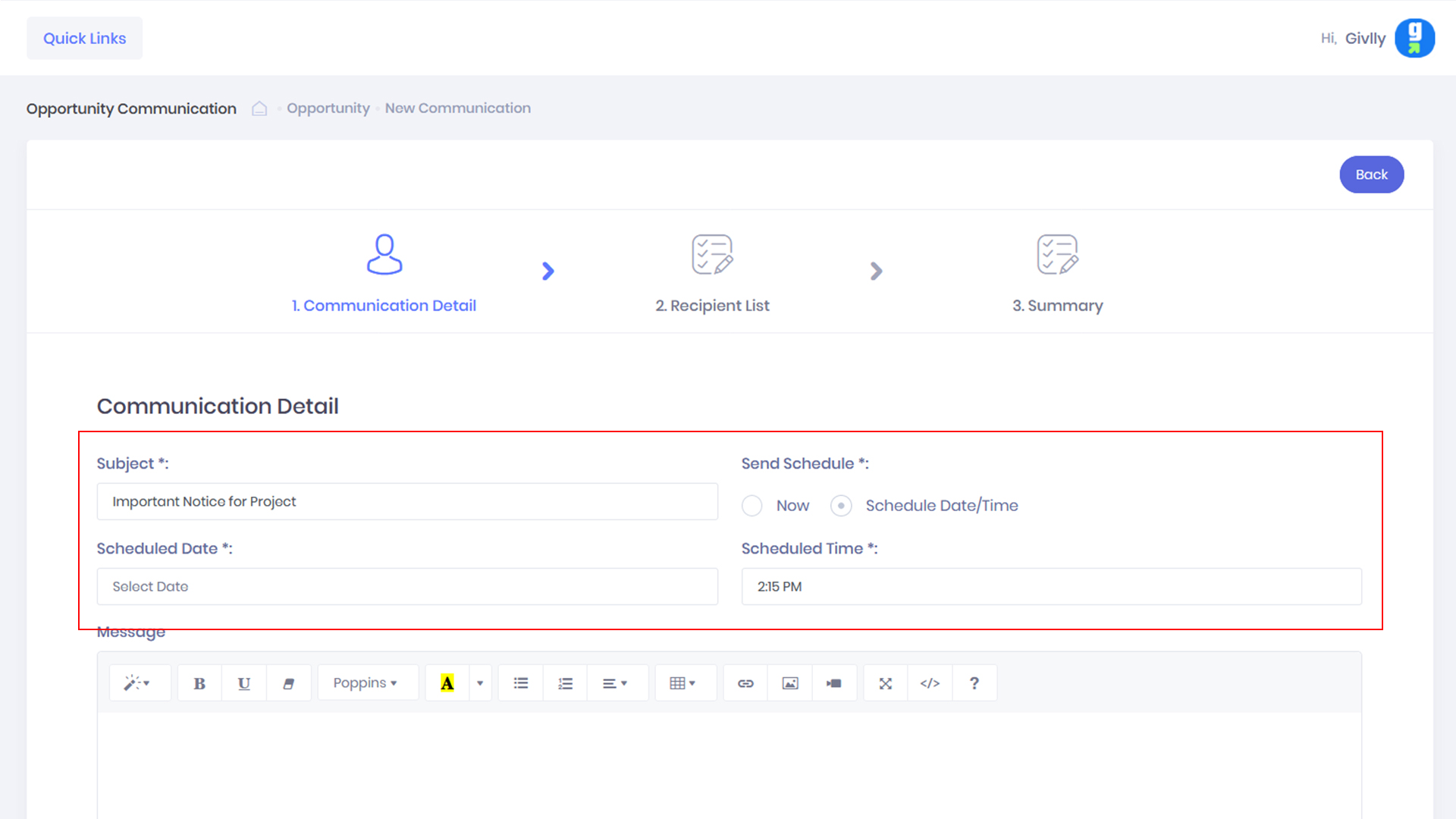 If you decided to send the email at later date and time, under Send Schedule, select the Scheduled date/ time.