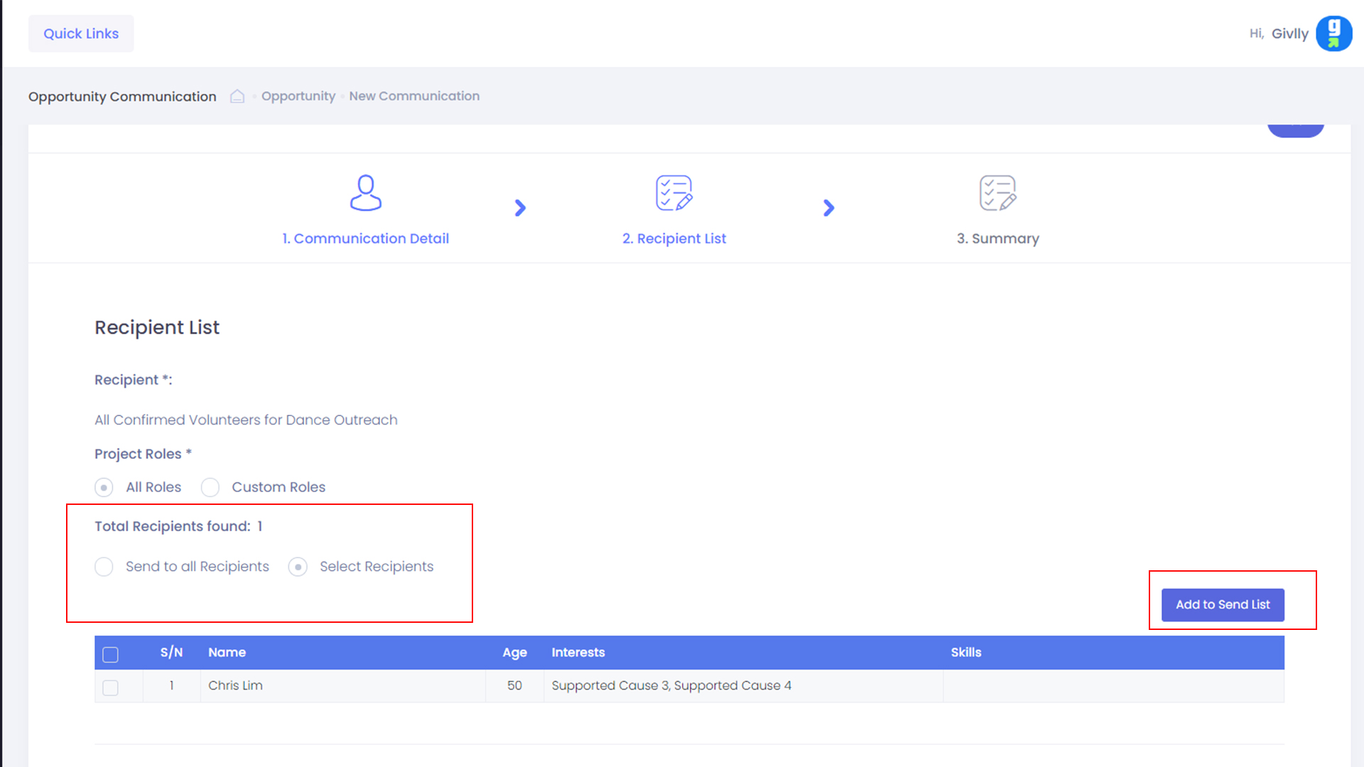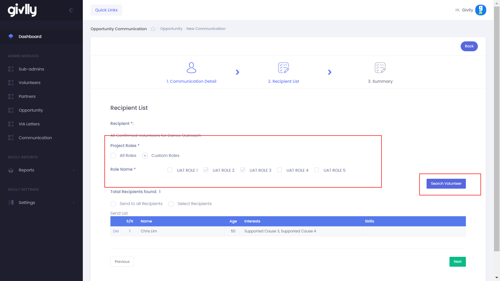 - If you decided to choose Custom Role, next select the required project role and click Search Volunteer button to display the list of confirmed volunteers that have registered for the selected role.
