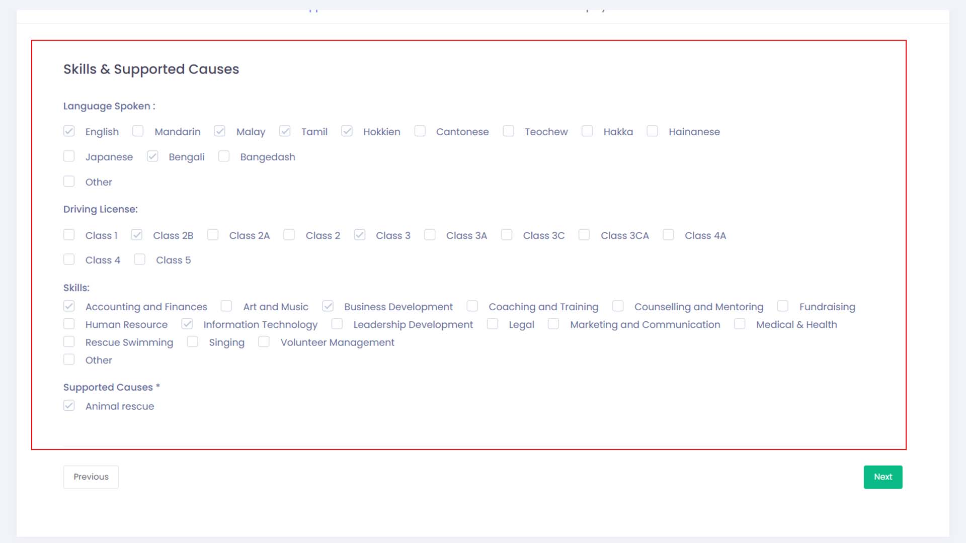 - Next is to set up the volunteer’s personal skillsets. Just click on the checkboxes beside the skills which your volunteer has. And once that is done, click on the Next button.