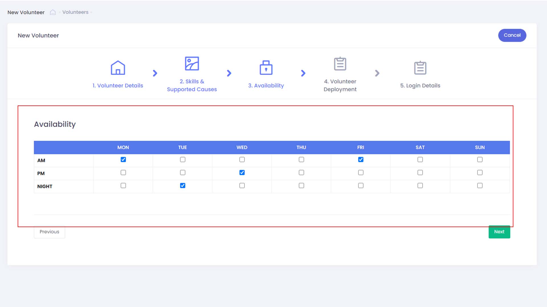 - Select volunteer availability based on the schedule provided by the volunteer him/herself and click the Next button when done.