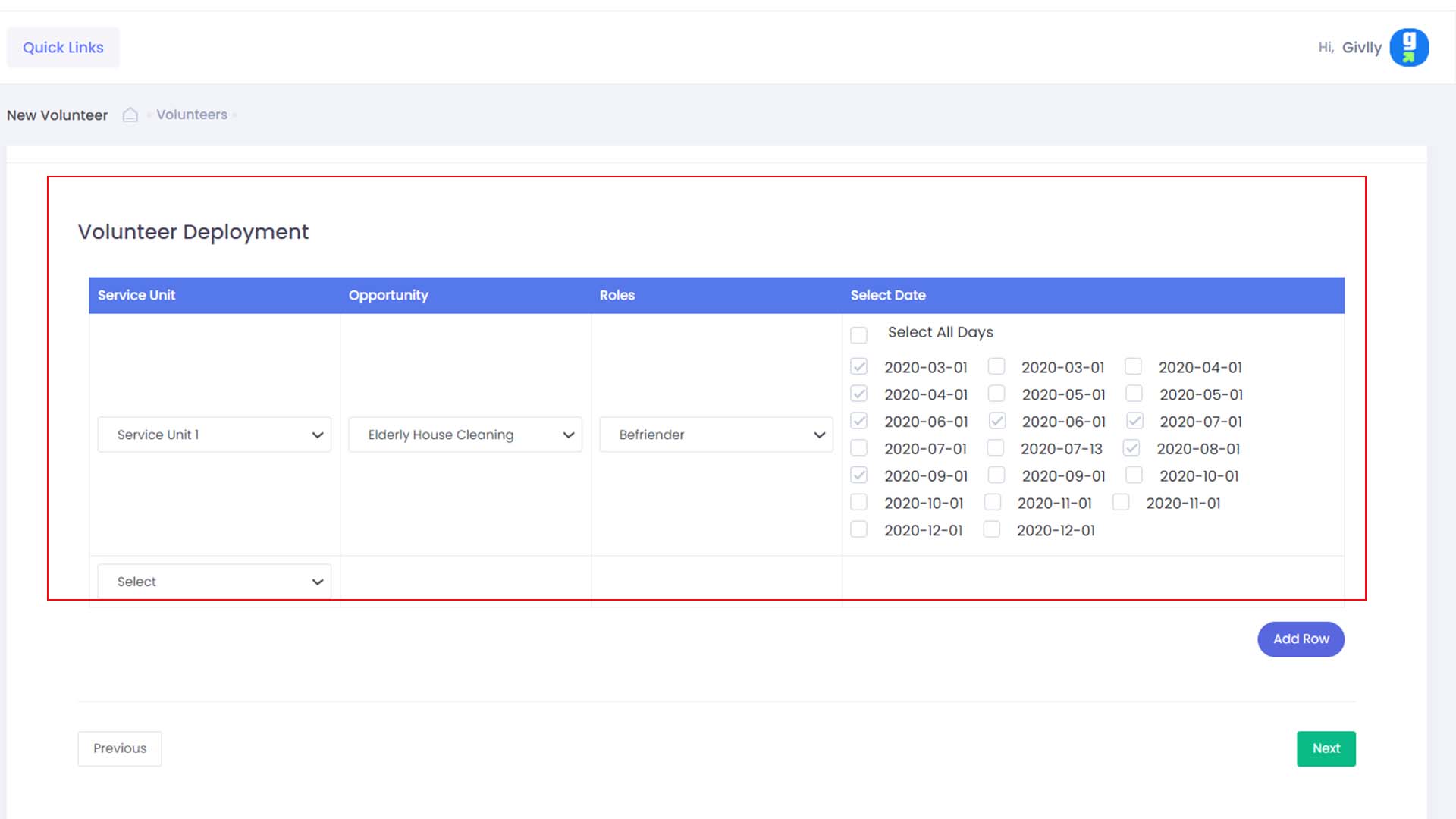 - Select the list of current volunteer opportunity to deploy the volunteer to if required and click the Next button.