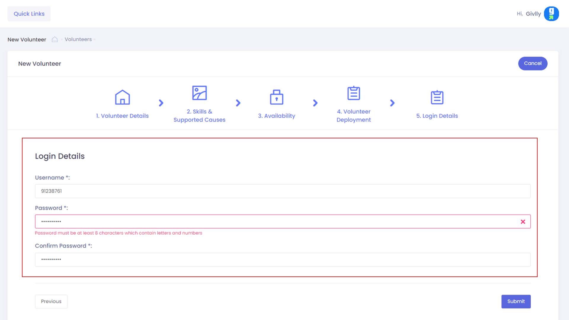 - Enter the password for the volunteer and click the Submit button to finish creating the new volunteer account