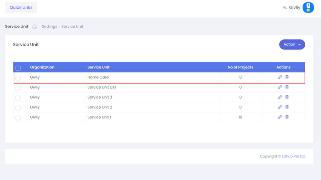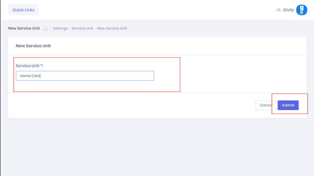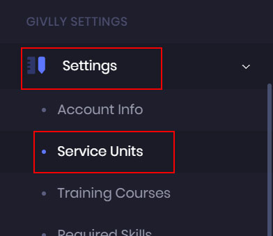 1. The first thing you want to do is to set up the services that your organisation is offering. To add the services, go to the left-hand side of your Givlly Dashboard and click on Settings and select Service Units.