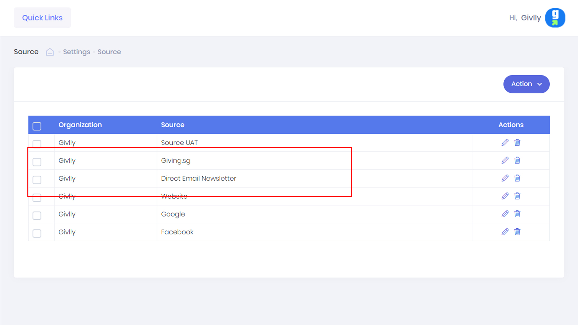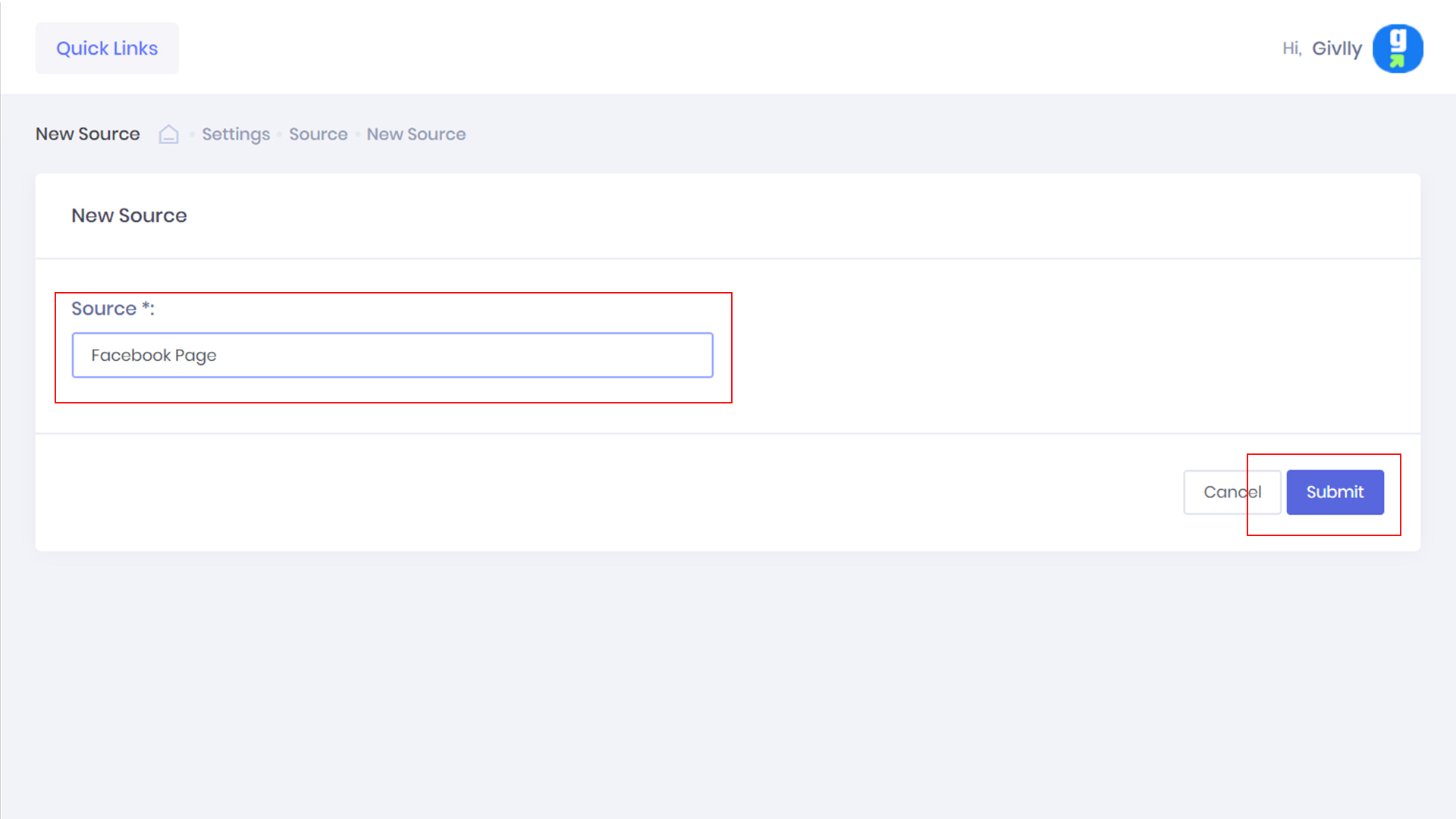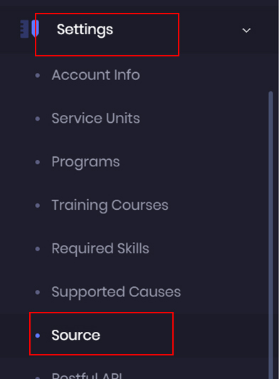 1. To add Sources, go to the left-hand side of your Givlly Dashboard, click on Setting and select Source.