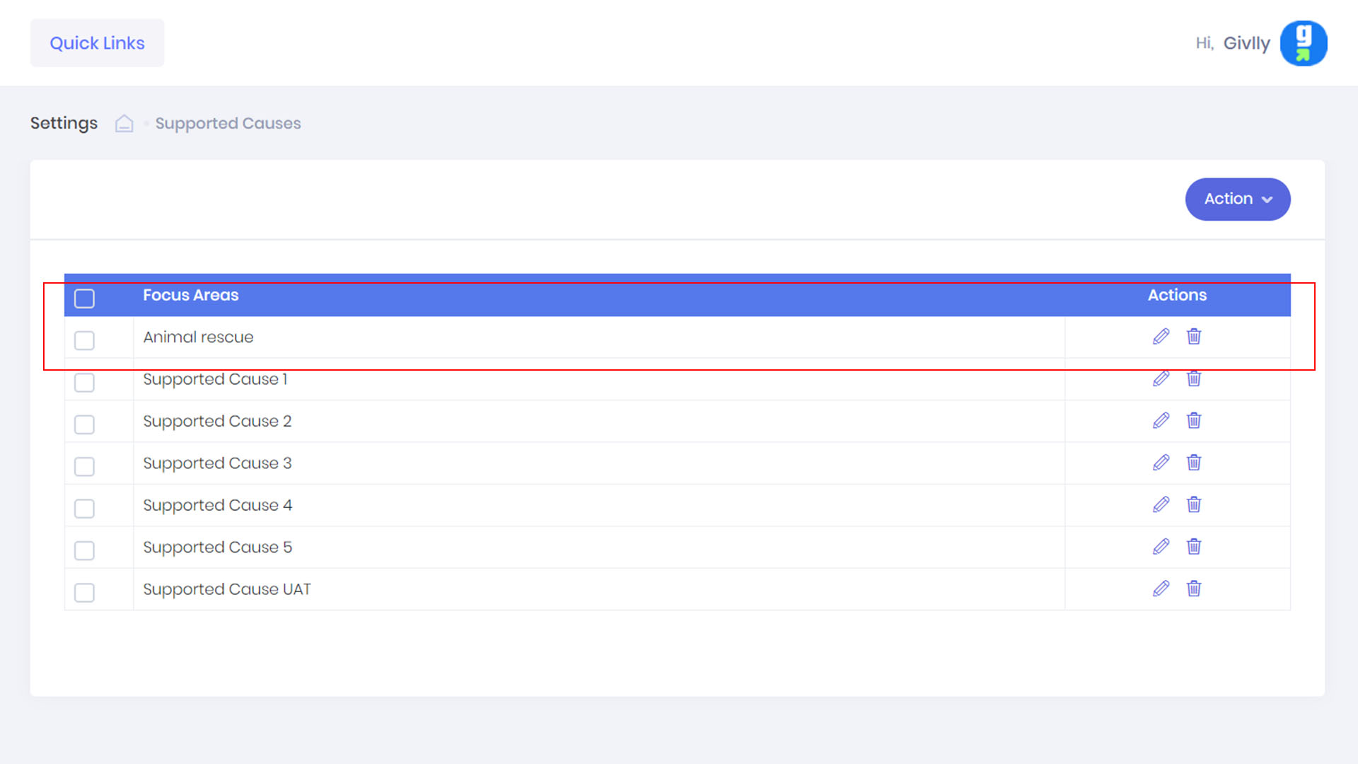 - To add the social causes which your organisation supports. Go to the left-hand side of your Givlly Dashboard and click on Settings and select Supported Causes.