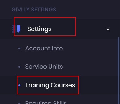 - To add the required Training Courses for your volunteers. Go to the left-hand side of your Givlly Dashboard and click on Settings and select Required Courses.